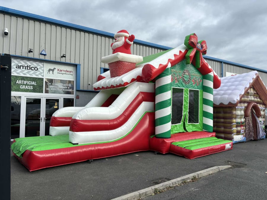 This eye-catching inflatable is designed in the style of a cosy Christmas cottage, complete with candy cane pillars, a giant red bow, a slide that kids will love, and Santa climbing down the chimney on top of the slide! Inside, little ones can bounce, climb, and explore in a safe and exciting play environment.