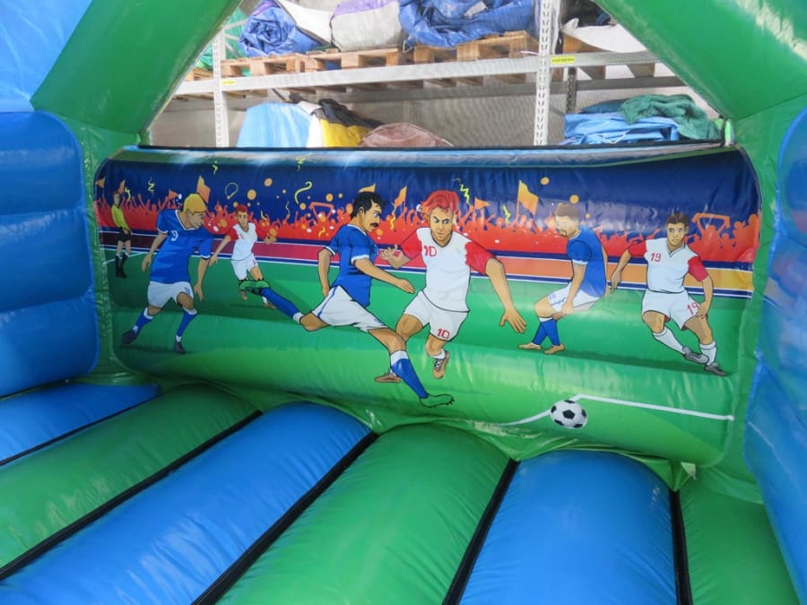 The back wall, side pillars and top beam of the bouncy castle feature superb digitally printed artwork of a generic football theme.