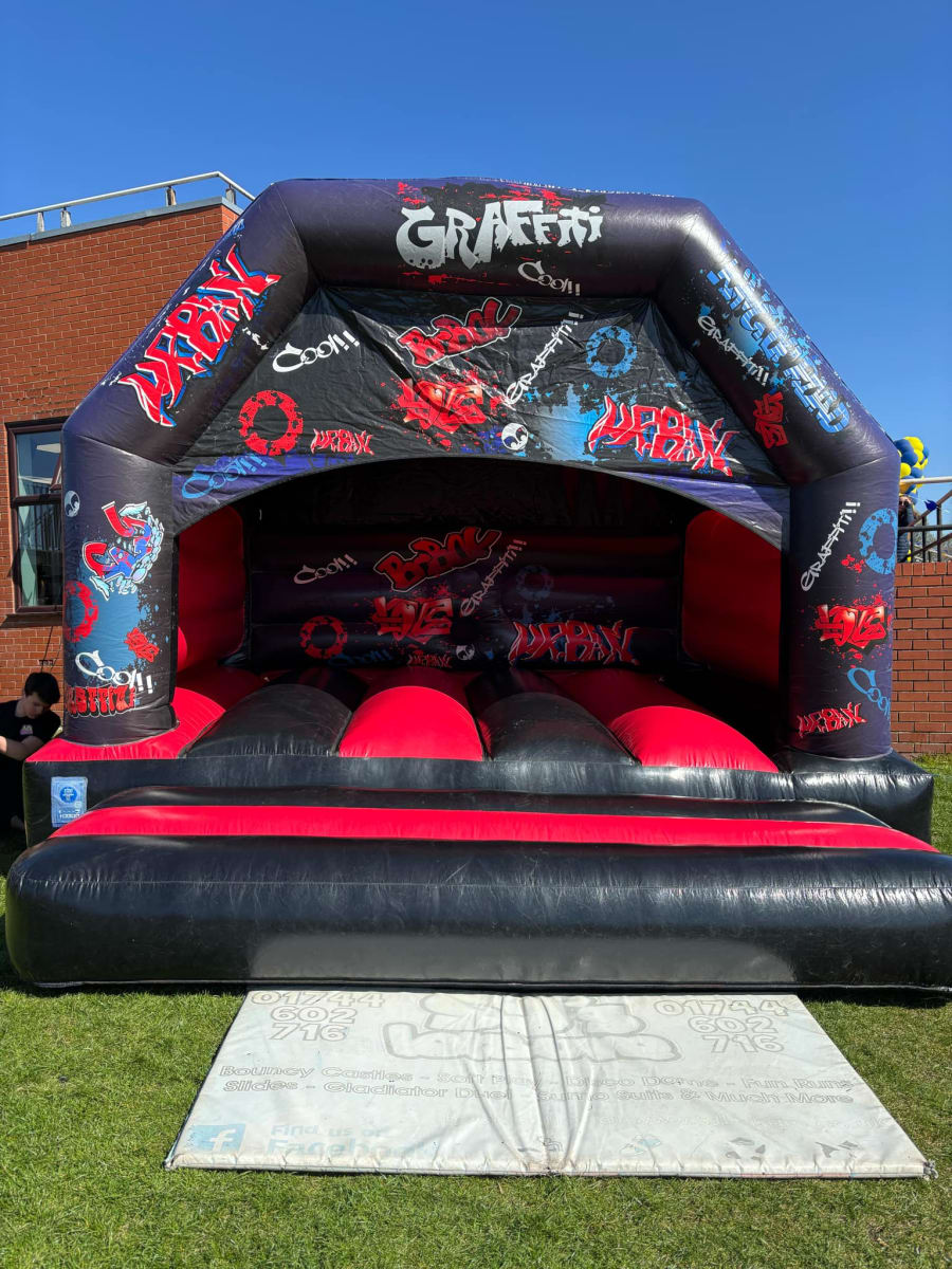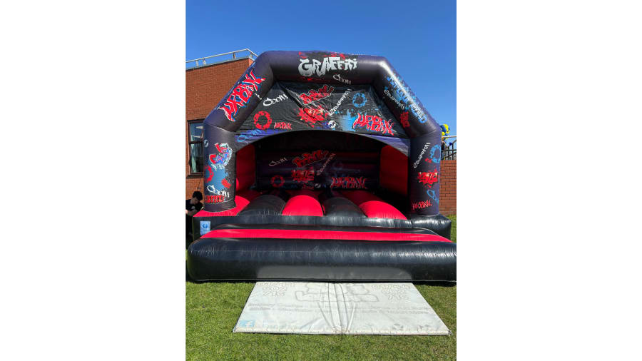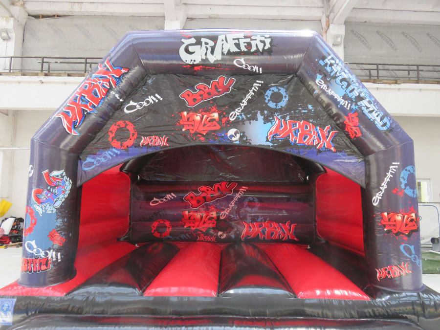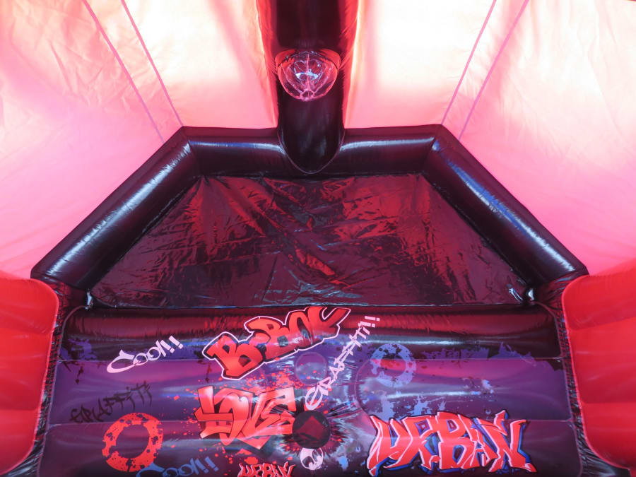 The colour scheme of this inflatable compliments the bouncy castle theme very well with red and black material used throughout. The top beam, side pillars and back wall of the inflatable are decorated with digitally printed artwork of user friendly graffiti style artwork.