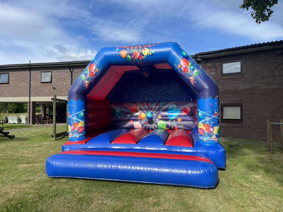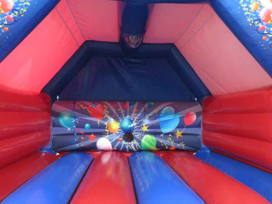 The colour scheme of this inflatable compliments the bouncy castle theme very well with red and blue material used throughout. The top beam, side pillars and back wall of the inflatable are decorated with digitally printed artwork of generic party style artwork.