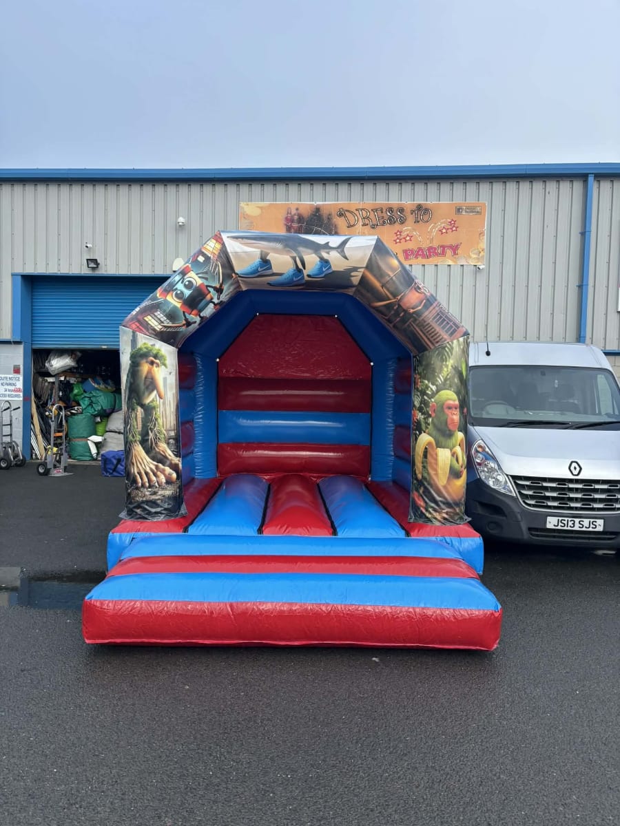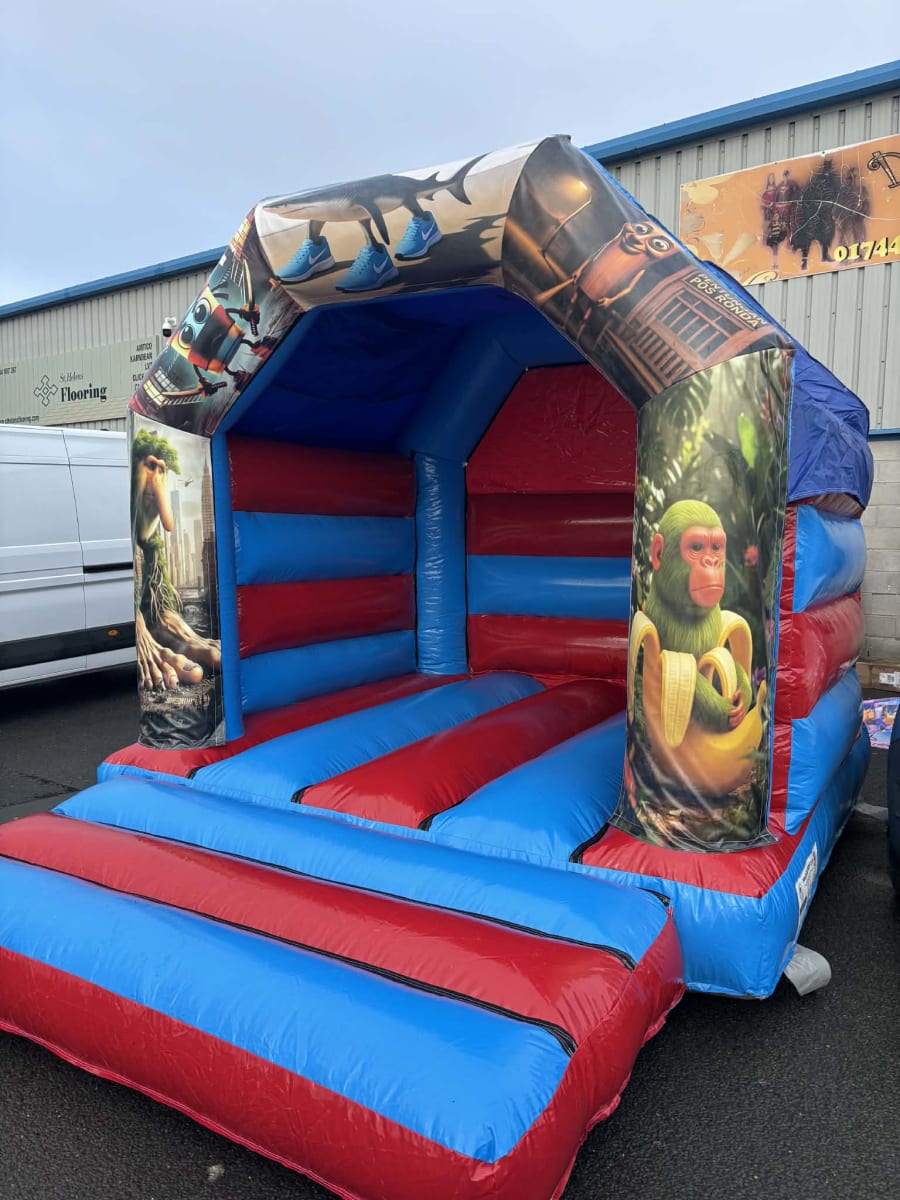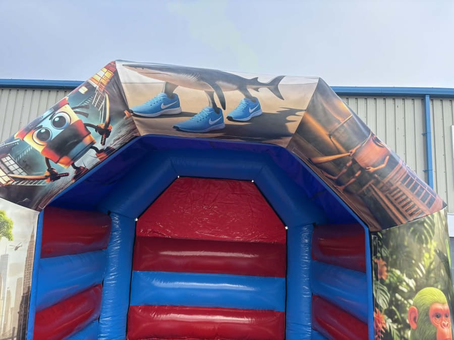 Add some wild, surreal fun to your party with our red and blue “Italian Brainrot” bouncy castle! Covered in bizarre and hilarious artwork across the side towers and top beam, this castle is a feast for the eyes and a playground for the imagination. You’ll spot characters like Tralalero Tralala – the shark sporting Nike trainers, Chimpanzini Bananini – the green-haired monkey tangled in a banana peel, Cappuccino Assassino – the samurai-like coffee cup, Tung Tung Tung Sahur – the wooden figure, and Brr Brr Patapim – the quirky tree character with big feet and a giant nose.