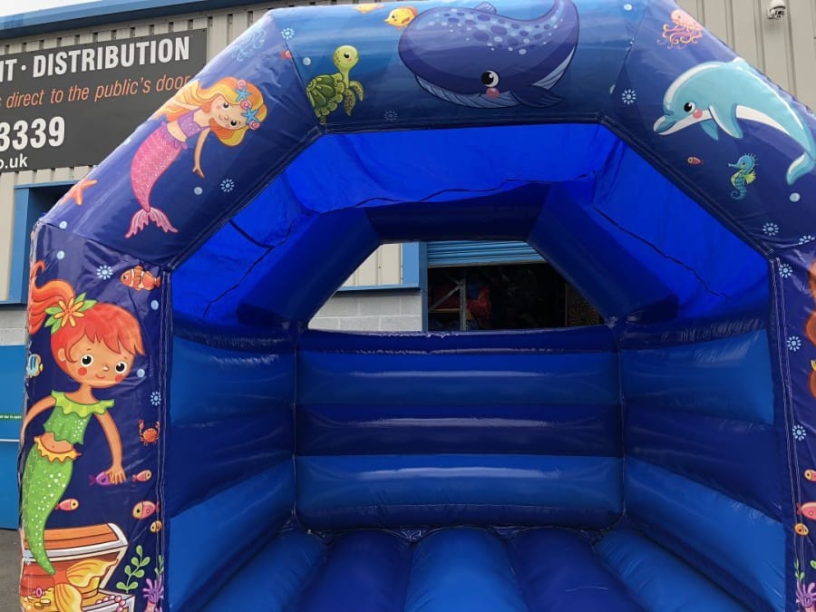 Digitally printed artwork features on the front pillars of the bouncy castle and across the top beam. The artwork features generic mermaids in pink, green and blue with other aquatic items such as dolphins and fish.
