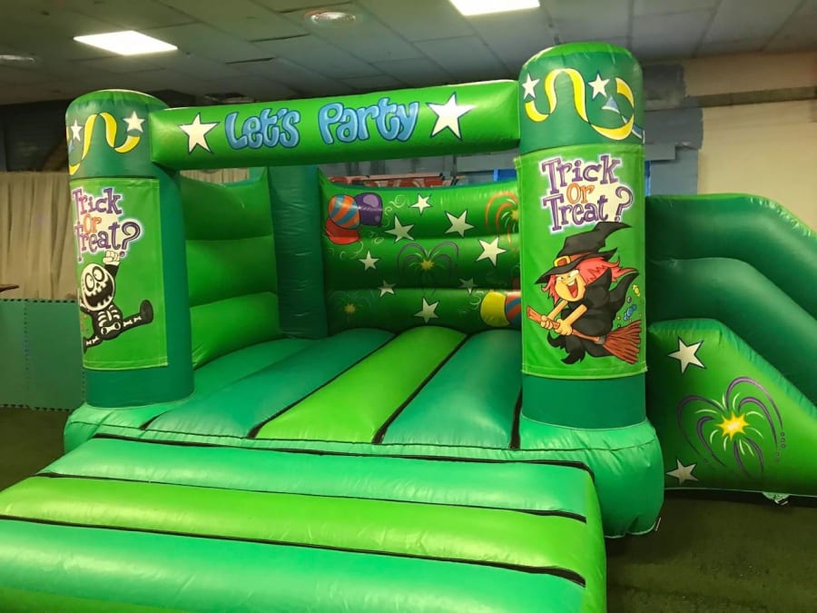 This type of indoor inflatable is very popular for our company and we have many hires each and every week with this style of bouncy castle. The back wall, side wall of the slide and top beam of this inflatable is decorated with stunning hand painted artwork from a really talented artist from our manufacturer. The artwork is a general party theme and shows party poppers, balloons, streamers, stars and more. On the front pillars of the bouncy castle and slide combo is some velcro panel artwork of a traditional 'Trick Or Treat' theme with a child friendly witch and skeleton illustrated.