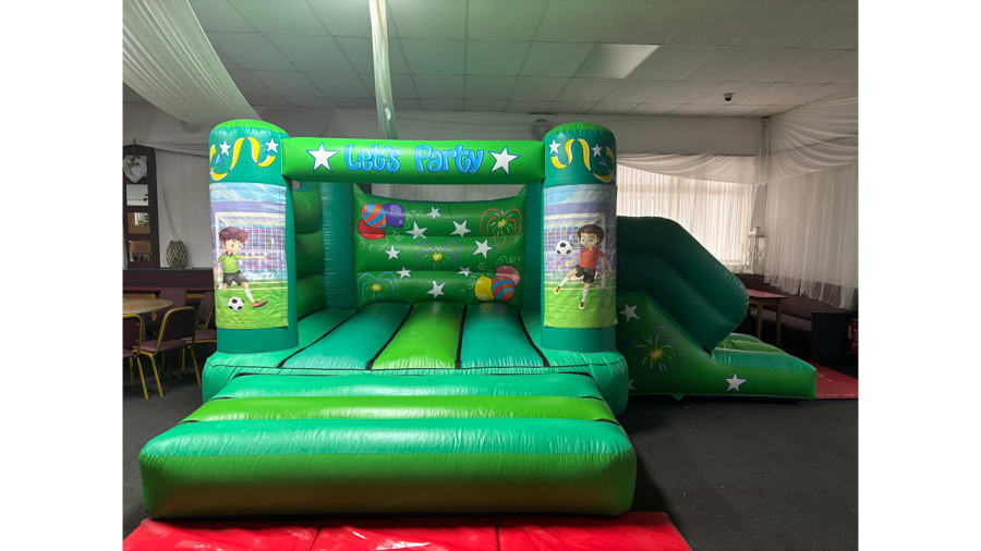 This particular bouncy castle and slide combo is manufactured right here in the UK and conforms with all of the inflatable safety standards set out in BS EN 14960:2013. The back wall of the inflatable features general party hand painted artwork of fireworks and the like with the let's party slogan across the top beam of the bouncy castle and more streamers artwork on the side pillars. Also on the side pillars of the bouncy castle and slide combo is two footballers, one in a red kit and one in a blue kit. Perfect for supporters of football teams in the Liverpool and Manchester area or surrounding area.