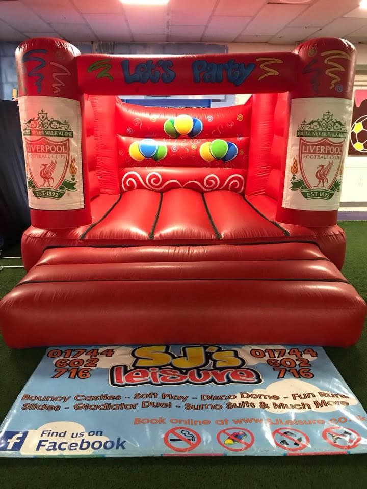 This bouncy castle is brightly coloured and the artwork features balloons on the back wall, streamers and poppers as well as the 'Liverpool' club crest on the front pillars of the castle.