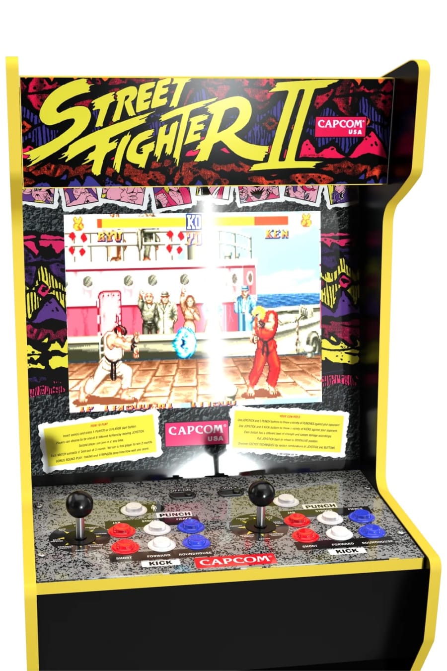 Experience iconic arcade games with the Arcade 1up Street Fighter Capcom Legacy Edition. Level up with unlimited retro gaming fun, no coins required. This Street Fighter games cabinet and riser set brings arcade nostalgia to your family game room, office or den.