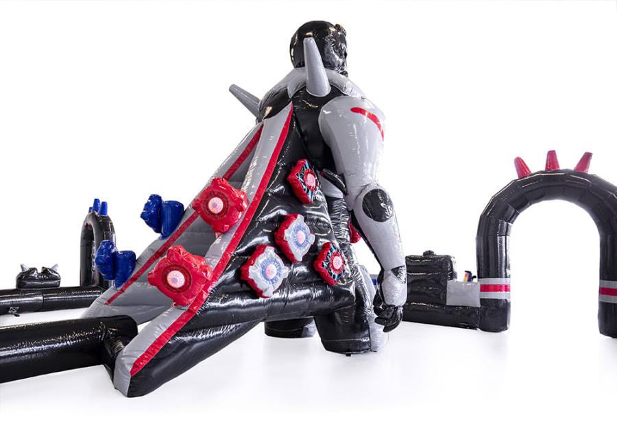 Users are each given a Nerf gun with loaded ammo and enter the inflatable course looking to gain the highest score possible. Each user will have selected a team / colour. Red team and green team. Users look to 'knock out' as many lights of their chosen team colour by shooting the Nerf bullets from the Nerf gun. For example, the red team will shoot at as many red lights as they can find.