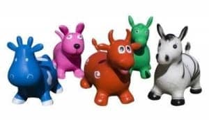 This product comes complete with inflatable track and five happy hoppers.