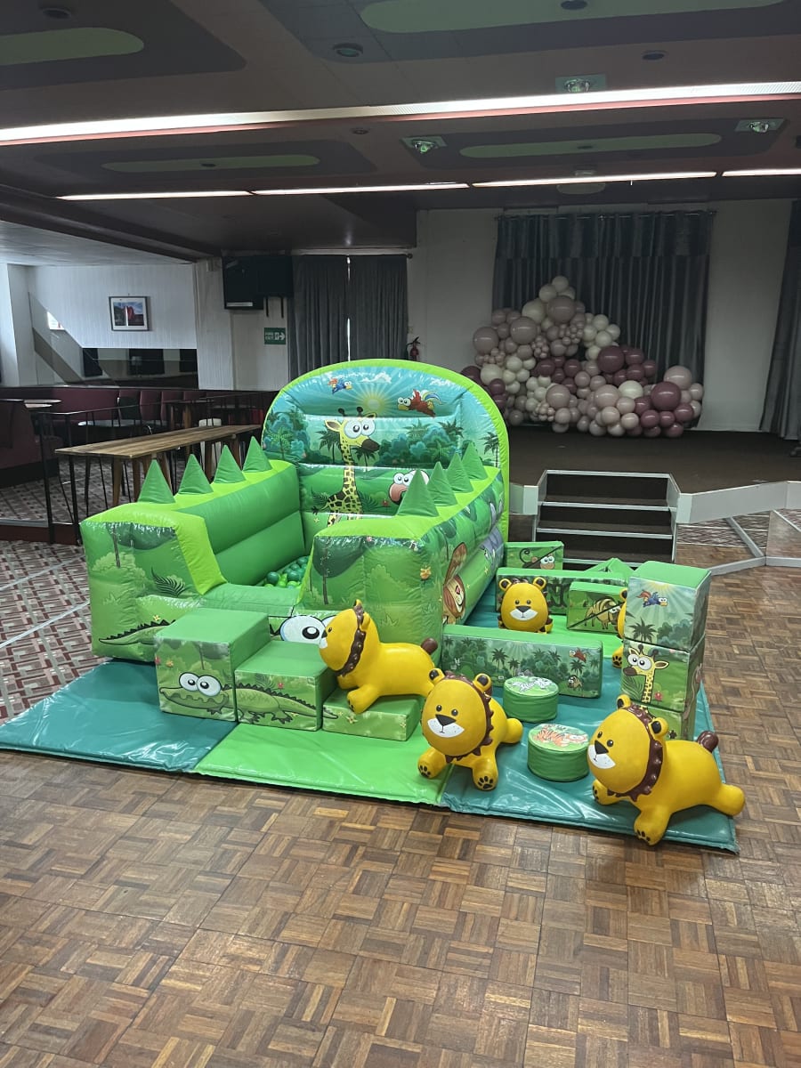 Suitable for indoor soft play hire, the listing photo shows our Jungle Soft Play Set Up on hire here along with lion hoppers.