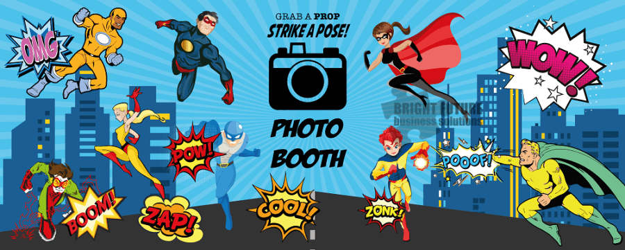 Perfect for boys parties and events such as birthday parties, christenings, holy communions and much more. This mini photobooth has been created with a non-copyright design and features superhero characters and the traditional comic style words such as 'Zap!', 'Boom!', 'Pow!' etc.