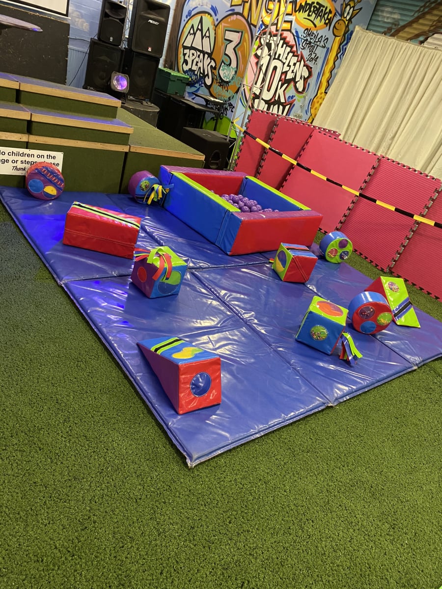All soft play pieces are set up on indoor soft play padded mats for the comfort of the users and we also provide a padded, soft play foam ball pool filled with plastic ball pool balls.