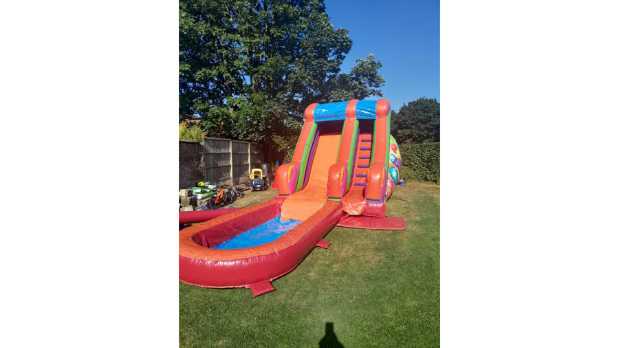Finished in vibrant orange, red, pink, and green panels with cheerful digital party-themed artwork, this inflatable water slide makes a stunning centrepiece at any event. Designed and manufactured in line with UK and European inflatable safety standards (BS EN14960), it provides a safe and enjoyable experience for children while giving parents peace of mind.
