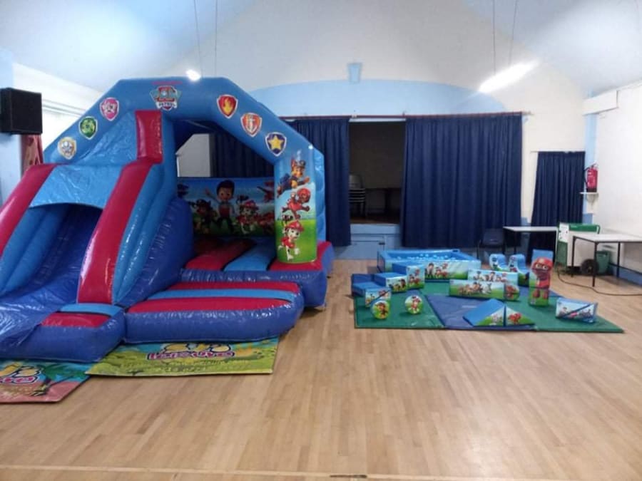 This package includes two official Paw Patrol products. A bouncy castle slide combo and a soft play set up.